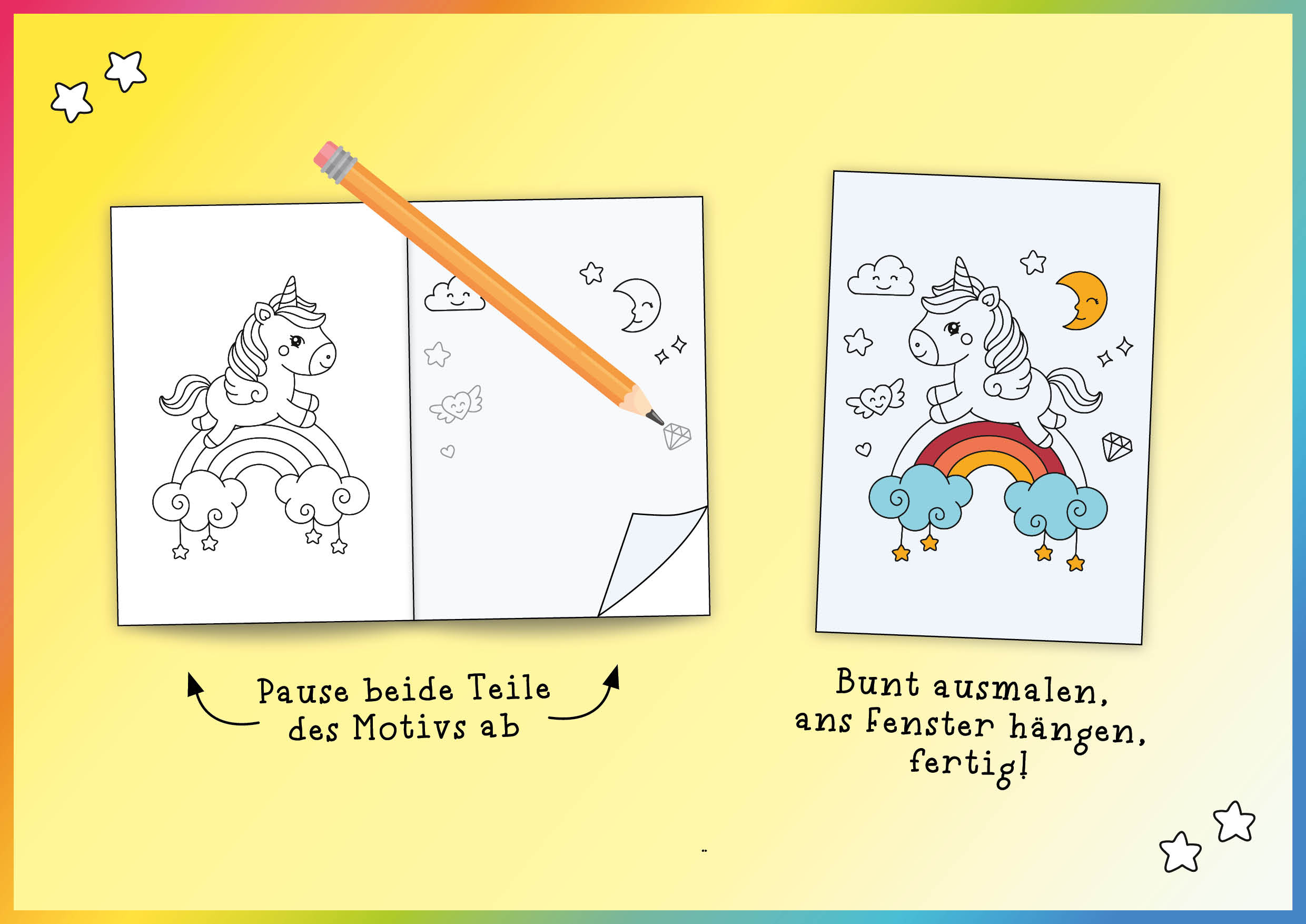 Kinder ab 4 Jahren können hier durch Abpausen von zauberhaften Prinzessinnen und Einhörnern spielend zeichnen lernen