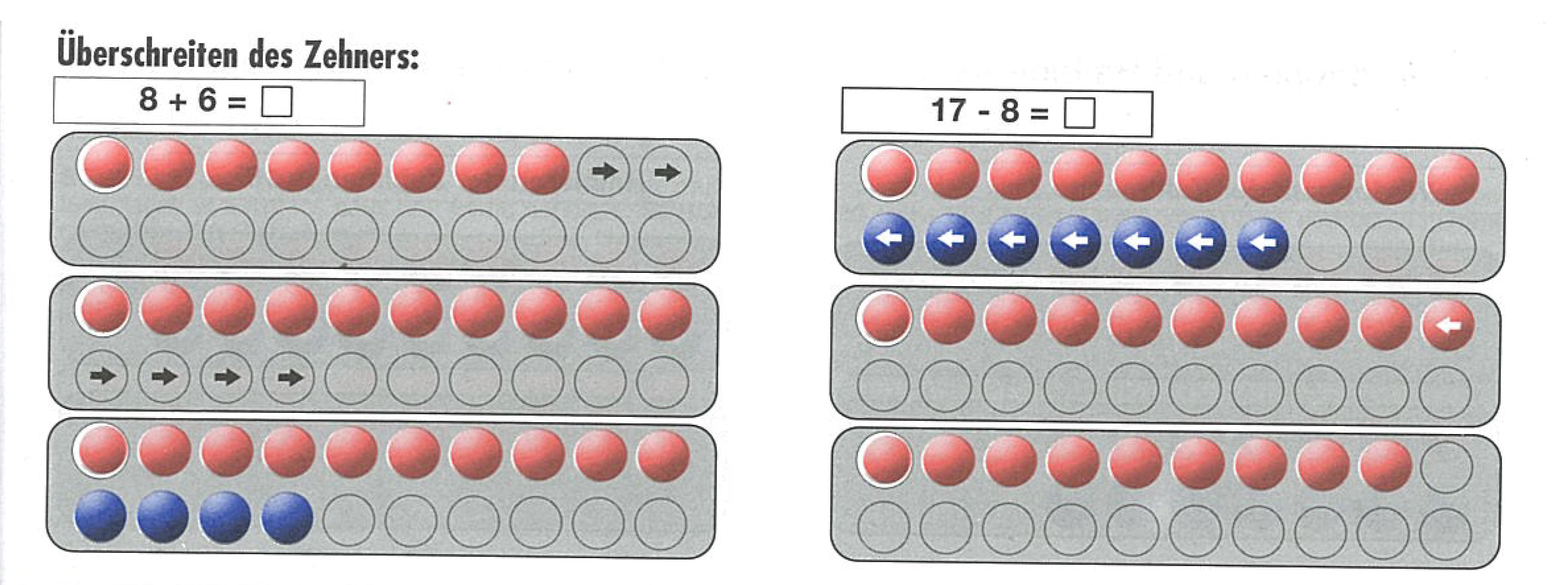 Besonders einleuchtend kann das Überschreiten des Zehners dargestellt werden, denn die Schritte bis 10 und